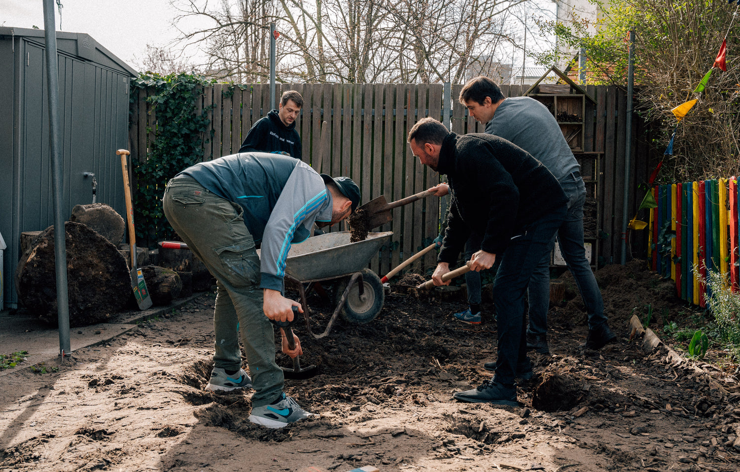 Dafür haben wir über 1 Tonne Kinderspielsand und 1.500 Liter Rindenmulch besorgt. Wir haben den kompletten Spielplatz aufgeräumt und das Material verteilt.